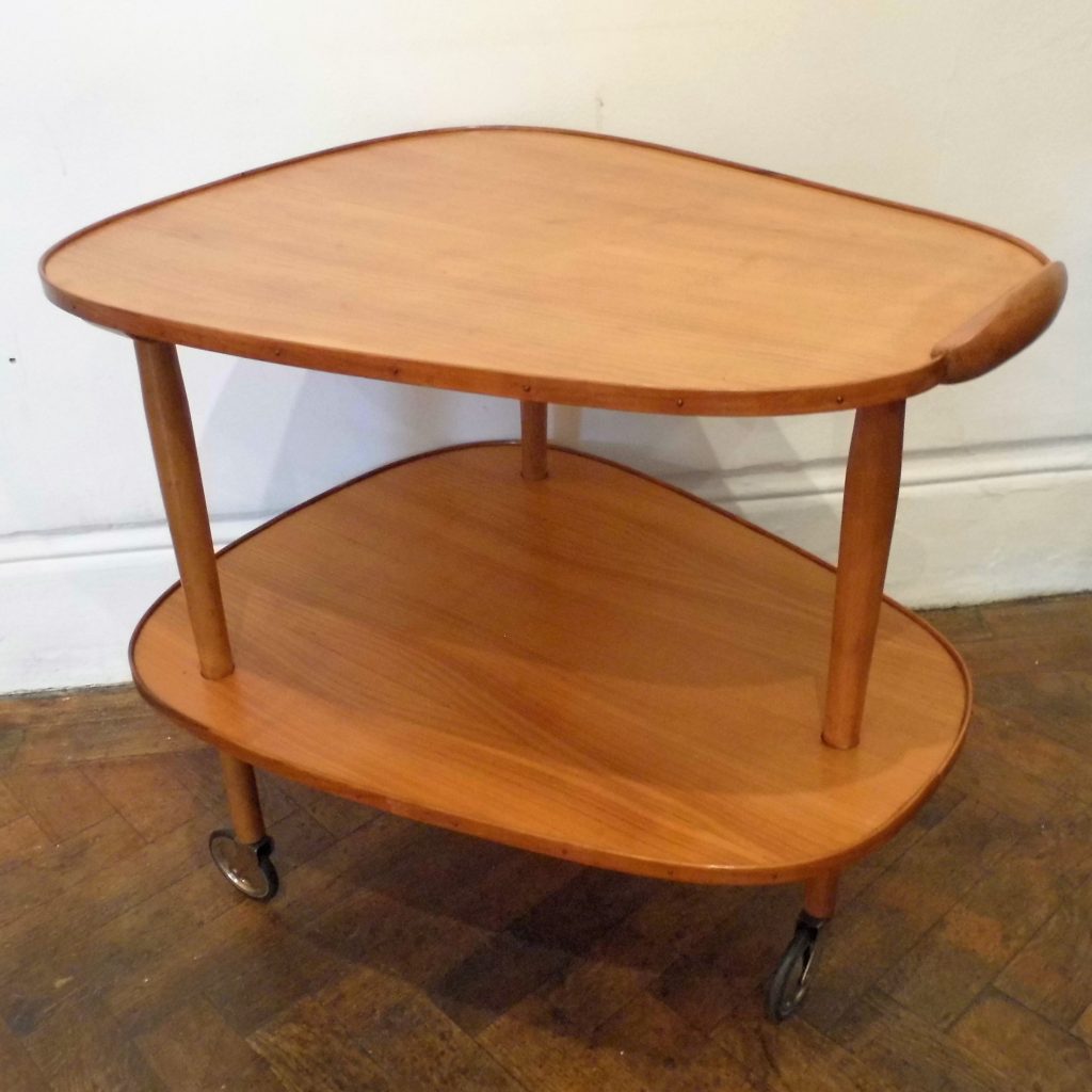 An attractive 1950s Birch Trolley from France. This is a nicely shaped Mid Century two tier trolley in honey coloured birch.
